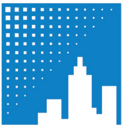 The mark consists of a partially shaded blue and white square featuring white rectangular buildings and small white squares arranged in a triangular pattern.
