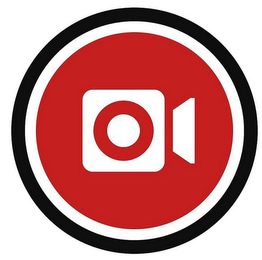 The mark consists of a stylized design resembling a video camera comprised of a white square with rounded edges with a red ring in the center and with a white trapezoid to the right of the square appearing inside a red circle surrounded by a white ring. The outer black ring is not a feature of the mark, but included only to show the placement of the white ring.