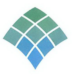 The mark consists of an array of nine squares in three rows and three columns that has been rotated and curved to match the contour of a sphere. The topmost square is green, the two next lower squares are green-blue, the three next lower squares are teal, the two next lower squares are blue, and the lowest square is cyan.