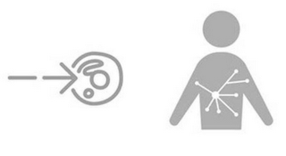 The mark consists of a dashed stem arrow pointing into a stylized cell to the left of an image depicting the upper body region of a human, where a circle represents the head and is not connected to the torso region, and the torso region contains a circle form which multiple lines radiate, each line terminates in a smaller circle or at least one branch and smaller circles.