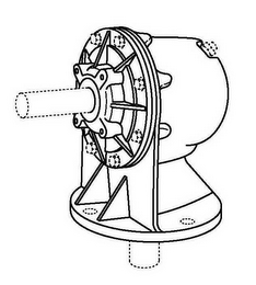 The mark consists of a three-dimensional configuration of a gearbox. The broken lines depicting shafts, bolts, holes for receiving bolts, and a pressure relief plug indicate functional elements and are not part of the mark.