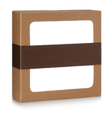 The mark consists of a three-dimensional configuration of a brown square box with an opening in the front and a dark brown horizontal bar across the middle; brown ticking decorates the edges of the bar. The dotted lines show the position of the horizontal bar and the claimed colors. The matter shown in dotted or broken lines is not part of the mark.