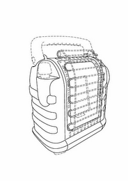 The mark consists of a configuration of a generally rectangular shaped portable heater with rounded upper corners and horizontal ribbing consisting of three raised ridges running across the back and sides of the heater, with a narrowly tiered base, and a raised pour spout on the left side rising from the uppermost ridge. The dotted lines are not part of the mark and only show placement of the mark on the goods.