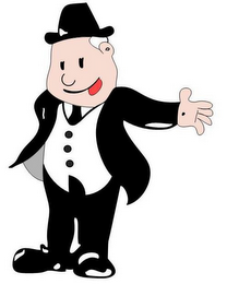 The mark consists of a cartoon person with arm outstretched, with black hat, suit, shoes, tie and buttons, red tongue, white shirt and hair, and tan face and hands.