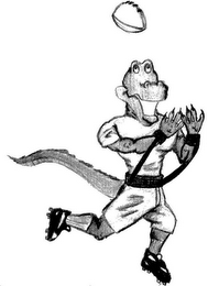 The mark consists of a stylized running alligator in football gear with its eyes looking up to a football and its arms held out, but with restraining straps, to catch the football.