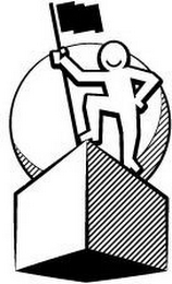 The mark consists of a rendition of a smiling human figure holding a flag in its right hand set against a circular device, the bottom fifth of which is displayed in a contrasting color; the above-described figure stands atop a cube-shaped device, the bottom of which is colored in a single color, the right-hand surface is colored in another color and the left-handed surfaced is not colored.