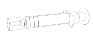 The mark consists of a three-dimensional product container in the shape of a syringe. The cap and plunger depicted in dotted lines are not claimed as individual features of the mark.