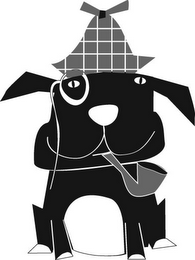 The mark consists of a depiction of a forward facing dog with a pipe in its mouth, wearing a monocle on its right eye and a houndstooth deerstalker cap on its head.