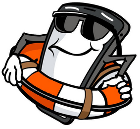 The mark consists of caricature of mobile telephone with a white body, eyebrows and hands and outlined in black and gray with gray arms outlined in black and with black, gray and white sunglasses. The telephone is sitting in a round floatation tube having alternating white and orange stripes with three brown straps, black outline and a black and gray horizontal stripe in the middle of the tube.