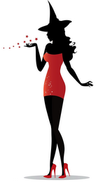 The mark consists of a witch design wherein the witch is a black silhouette blowing red stars, wearing a red dress with white star highlights and red shoes, on a gray shadow.