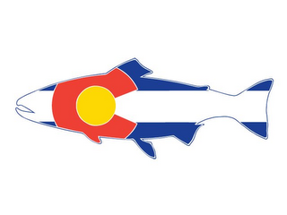 The mark consists of the stylized Colorado state flag with three horizontal stripes and a stylized red letter "C" superimposed over a design of a fish facing left, wherein the top and bottom stripes are dark blue, and the middle stripe is white. The letter "C" is partially displayed in the left portion of the fish design and filled with a yellow disc outlined by a thin white border, which also outlines the letter "C". The fish design is outlined by two thin borders in white and dark blue.