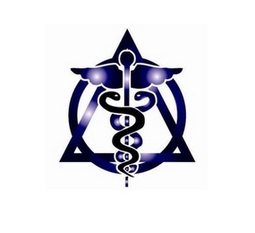 The mark consists of the caduceus, in a black and purple gradient. Behind the symbol, an image of an interlocking triangle and circle, in a black and purple gradient, is placed. Several flares are placed throughout the image, in white.