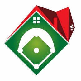 The mark consists of a green diamond with a stylized white baseball diamond in the center and four white squares in the upper middle and a stylized red and dark red roof above the upper sides of the green diamond, the roof having four white diamonds in the right portion.