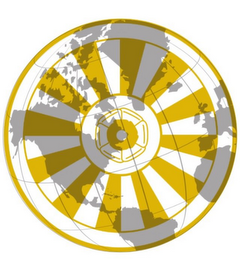 The mark consists of a black and white globe, showing continents and longitude and latitude lines in black, overlapped by a yellow wheel and spoke design.
