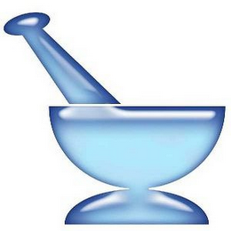 The mark consists of a round mortar with an inverted round base and the handle of a pestle protruding from the bowl of the mortar to the left in blue with shading effects.
