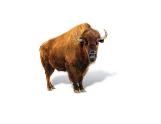 The mark consists of a live American buffalo character having brown fur, light brown horns and hooves, a black nose and anthropomorphic features, including the ability to speak English. The color gray appears in the shadow design of the buffalo.