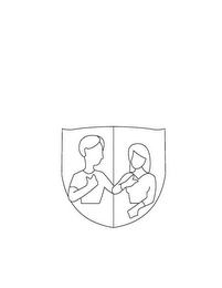 The mark consists of two people icons from the torso up doing sign language all in an outline of a shield.