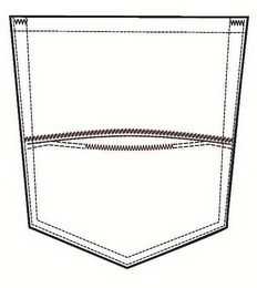 The mark consists of multiple top and bottom lines running horizontally across the back pocket creating a slightly overlapping convex shape, the top horizontal lines including a stitched line and the bottom horizontal lines including two parallel stitched lines and a zig-zag line. The shape of the pocket, the dotted lines, and the squiggly lines positioned around the perimeter of the pocket are used to represent placement of the mark and are not claimed as a feature of the mark.