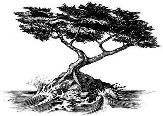 The mark consists of a depiction of a torrey pine tree, set on a rock, surrounded by water and crashing waves.