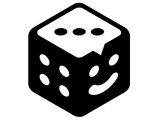 The mark consists of a cube that resembles a dice with three visible sides or panels; the top side of the cube has three dots inside a dialog bubble with a small triangle pointing downward into the top of the front right side panel; the front left-side panel of the cube has a total of four dots, two of which are located over the other two dots; and the front right-side panel has a smiling face composed of two dots located over a curved line.