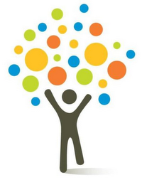 The mark consists of a stylized human with arms upraised in the color black. Above the shoulders and head of the human are a series of circles of various sizes which appear in the colors blue, green, yellow and orange.