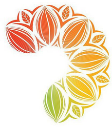 The mark consists of a circular pattern of stylized cocoa pods with leaf designs placed in between each pod, gradually changing from red to orange to yellow to green. The color white represents background and transparent areas and is not part of the mark.