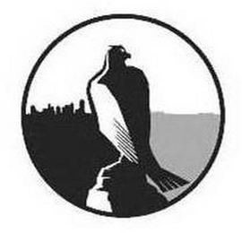 The mark consists of a circle design inside of which is a hawk perched on a ledge overlooking the skyline of a city.