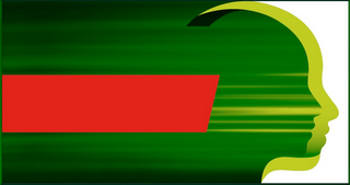 The mark consists of a dark green and light green gradient background with the dual profiles of human heads facing to the right located on the right side of the image and outlined in dark green fading to light green. The right edge of the light green profile is adjacent to a white background. A red, right slanted rectangle is overlaying the middle third of the green portion of the background from the left edge to two thirds of the width of the total image.