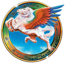 The mark consists of a pink-tinged, white, winged horse with rainbow-colored wing including blue, red, and green posed over a circular seal with a blue sky and some white clouds, encircled by an outer gold border, middle black border, and thick rainbow-colored inner border including red, yellow, green, and blue, with silver and gold line pattern design.