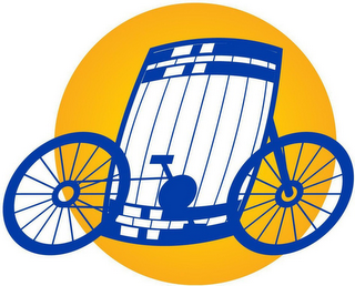 The mark consists of a blue keg-shaped bicycle, with a blue and white keg between two blue wheels, one of the wheels coupled to a blue pedal set, the keg-shaped bicycle positioned on a yellow background circle.