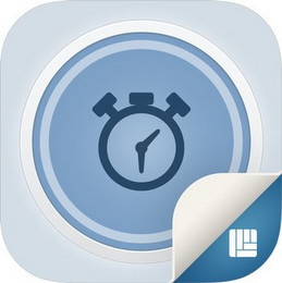 The mark consists of an application tile featuring an image of a dark blue stopwatch at its center and superimposed on a blue circle. The blue circle is surrounded by a series of small and large circles in varying colors, including gray, light blue and white. All of the circles and the stopwatch are superimposed on a white rounded square-shaped tile. The lower right corner depicts a white triangular pattern which gives the impression that part of the image is being peeled away to reveal to a white rounded-corner square logo superimposed over a dark blue background. The square logo is composed of four vertical polygons and two horizontal polygons.
