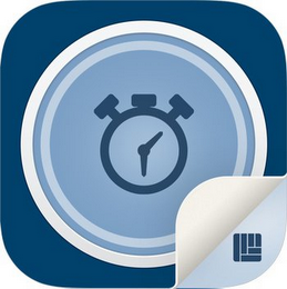 The mark consists of an application tile featuring an image of a dark blue stopwatch at its center superimposed on a blue circle. The blue circle is surrounded by a series of small and large circles in varying colors, including light blue, white and gray. All of the circles and the stopwatch are superimposed on a dark blue rounded square-shaped tile. The lower right corner depicts a white triangular pattern which gives the impression that part of the image is being peeled away to reveal a dark blue rounded-corner square logo superimposed over a gray background. The dark blue square logo is composed of four vertical polygons and two horizontal polygons.