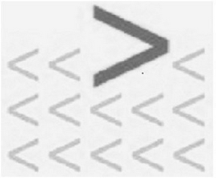The mark consists of an abstract depiction of swimming fishes consisting of thirteen less than symbols, with one larger greater than symbol in the top center.