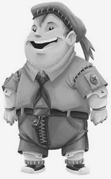 The mark consists of a young smiling boy with marionette features wearing a costume consisting of shorts, short sleeved shirt, neckerchief, sneakers and beret.