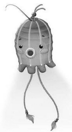 The mark consists of a character whose face consist of beaded eyes and an open mouth, with two strings of rope hanging from its bottom.
