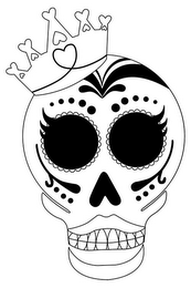 The mark consists of a stylized skull with a crown tilted on the upper right side of the skull. The skull consists of a curved line design at the top of the skull, two large eye sockets with each socket featuring three "wings" protruding outside of each socket, and the border of the sockets featuring a repeating curved design. Each socket is topped by five circles that represent eyebrows. Under each eye socket is a stylized curved line design that points down to the nose. Each of these curved designs has three circles underneath. The nose is in the shape of an upward pointing arrow. The bottom of the skull contains a teeth and chin design. The crown has five points with heart shapes at the top. The body of each point contains an upside down heart design. The main body of the crown contains a line drawing of a heart with the line extending away from the heart to both the left and the right.