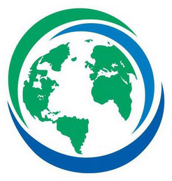 The mark consists of a green graphic depiction of world land masses encircled by one green and two blue overlapping crescent shaped lines.