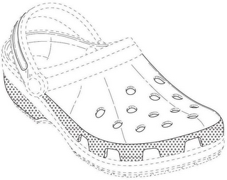The mark consists of a three dimensional configuration of the outside design of an upper for a shoe comprising a pattern of 13 round holes on the horizontal portion of the upper of the shoe, a textured strip along the vertical portion of the upper having a pattern of 7 trapezoidal openings, a textured strip on the heel of the shoe and a decorative band along the length of the heel strap. The broken lines show the position of the mark and are not claimed as part of the mark.
