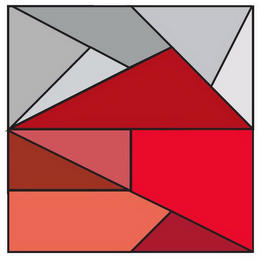 The mark consists of an overall square shape outlined in black. Within the square various polygonal shapes appear, all outlined in black. The square is divided into two horizontal rectangles. The rectangle on top is composed of five triangles and one quadrilateral. Beginning at the upper left corner and rotating clockwise around the top rectangle, the colors and shapes are: a dark grey triangle, a dark grey quadrilateral, a medium grey triangle, a light grey triangle, a red triangle and a light grey triangle. The bottom rectangle is composed of three triangles, one quadrilateral and one pentagon. Beginning at the upper left corner with the triangle whose side is parallel with the square and rotating clockwise around the bottom rectangle, the colors and shapes are: a rose triangle, a crimson quadrilateral, a maroon triangle, a coral pentagon and a red orange triangle. The white background is not claimed as a feature of the mark.