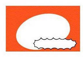 The mark consists of an orange rectangle figure with two white openings, one being in the shape of a horizontally positioned and slightly slanted oval and the other in the shape of an abstract speech bubble with a zig-zag black border on the lower right side of the drawing.