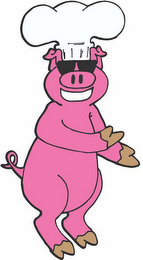 The mark consists of a standing pink pig, outlined in black, with brown feet wearing black sunglasses and a white toque and white mouth.