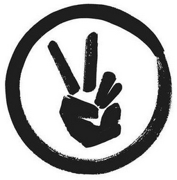 The mark consists of a hand in the shape of a peace sign inside of a circle.