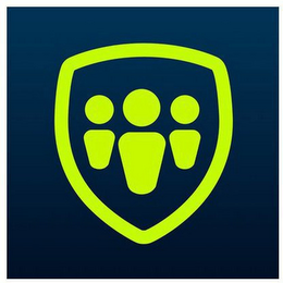 The mark consists of an outline of a shield with three stylized human figures inside of it. The human figures consist of circles on top of shaded quadrilaterals with curved sides. The exterior of the shield and the human figures are green. The background of the shield and of the mark are blue.