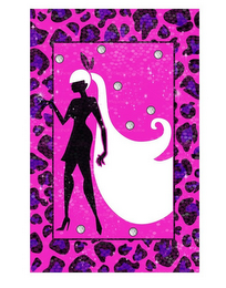 The mark consists of a black silhouette of a woman wearing a black dress and black high heels facing left with long flowing white hair in a ponytail tied with a black bow. Her right hand is raised with a large diamond ring on it outlined in white. The woman is inside a rectangle outlined in black filled with a bright pink background and eight diamonds scattered around her outlined in black and colored white and silver. This rectangle is surrounded by a rectangular pink border with a purple and black leopard print.