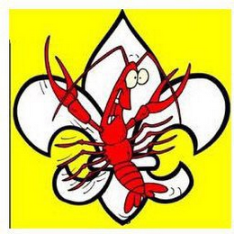 The mark consists of a stylized crawfish in red outlined in black with bulging white eyes, overlaid on a white fleur-de-lis, outlined in black and all against a yellow background.