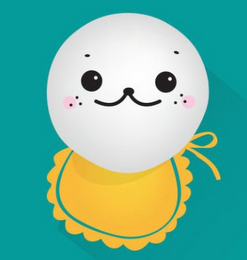 The mark consists of the face of a seal (round eyes, small eyebrows, freckles with blushing cheeks, and connected nose and grinning mouth) which is wearing a yellow, frilled bib that has a teal line near the border of the bib; the bib's tie is yellow and partially visible on the top-right of the bib; the teal background is not part of the mark.