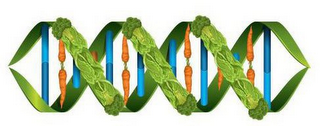 The mark consists of a representation of DNA helical strands in dark green and green with dark green and green broccoli heads and light green stalks and green and light green leaves on the front of the strands. In the space between the strands are orange carrot representations with green leaves and black accents and dark blue and light blue columns representing base pairs. The white in the mark is background area which is not a part of the mark.???? ????