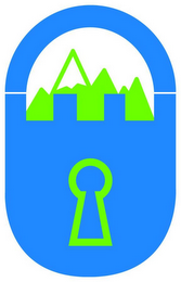The mark consists of a blue oval shape depicting a padlock, with the key hole outlined in green in the middle of the padlock image with a green mountain landscape design with a white snowcap behind the padlock opening on a white background.