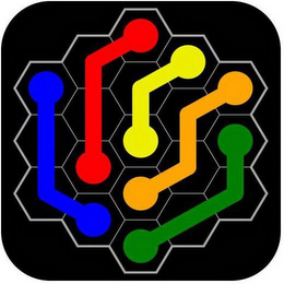 The mark consists of five angled lines with circular endings in blue, red, yellow, orange and green against a black hex grid with grey lines.