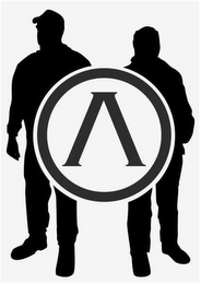 The mark consists of Silhouette figures of two men standing and facing outwards on either side of the outline of a circle with the Greek letter, lambda, inside the circle.